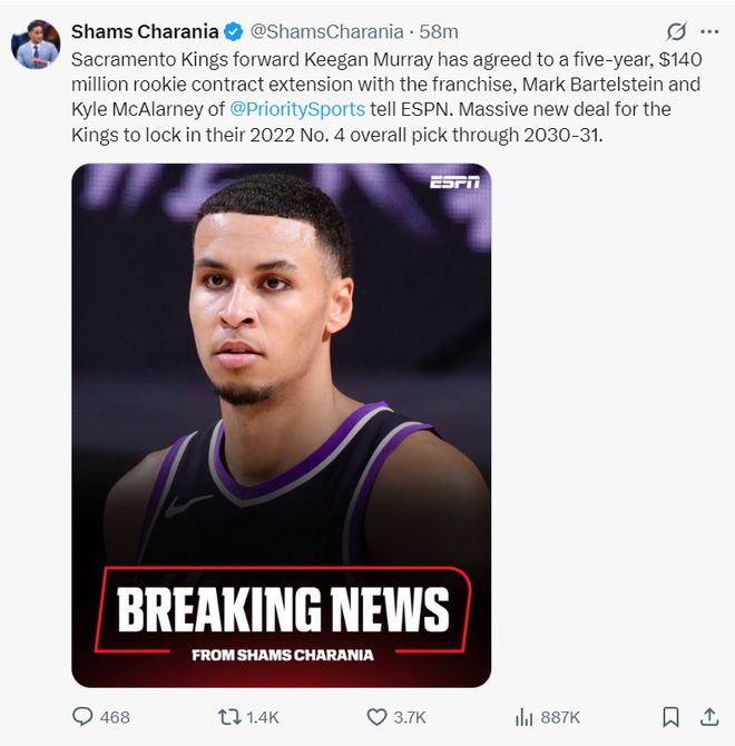 随后Shams又透露,国王队与22年第四顺位的基根-穆雷达成五年1.4亿的提前续约,这份合同不包含球员选项、球队选项,这份合同将在2030-2031赛季才到期。